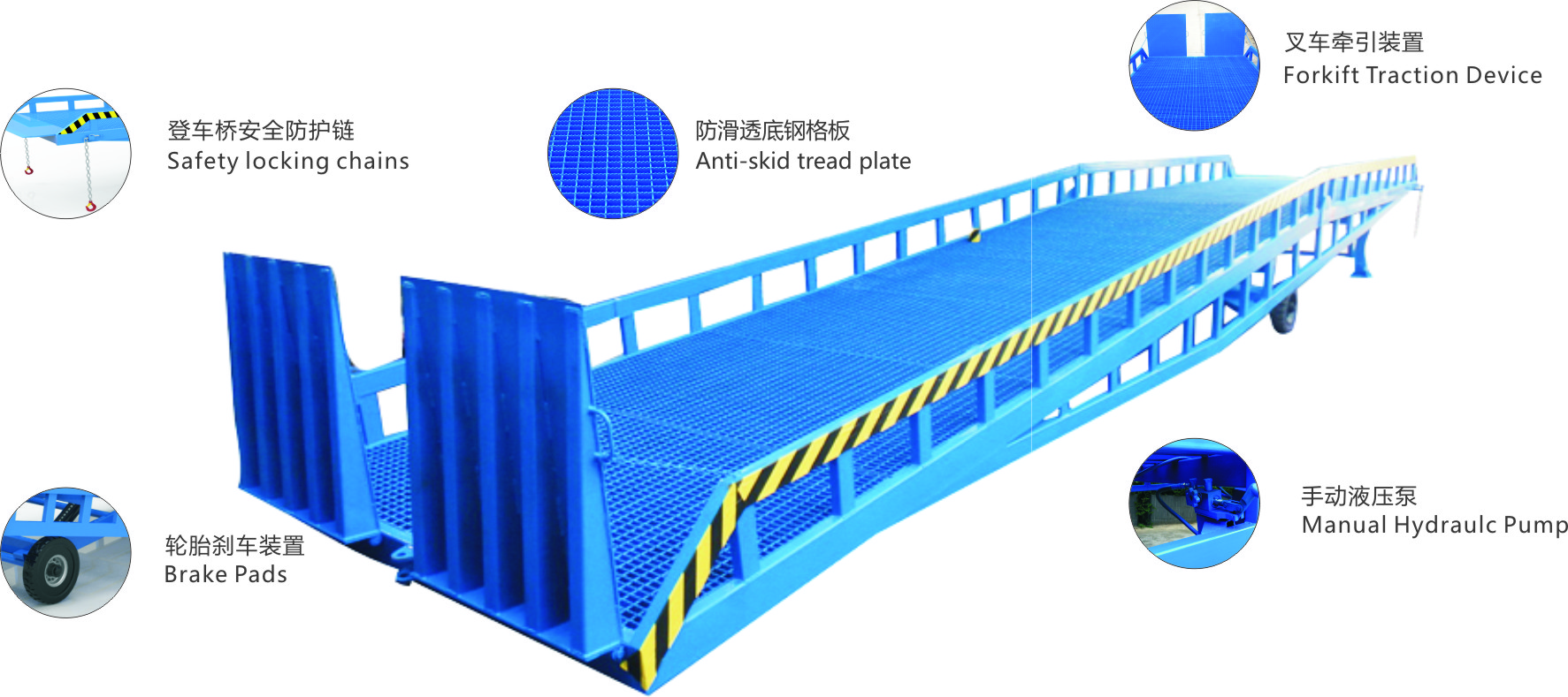 尾部折疊式過(guò)渡板和叉車(chē)牽引鉤可以方便的移動(dòng)登車(chē)橋。