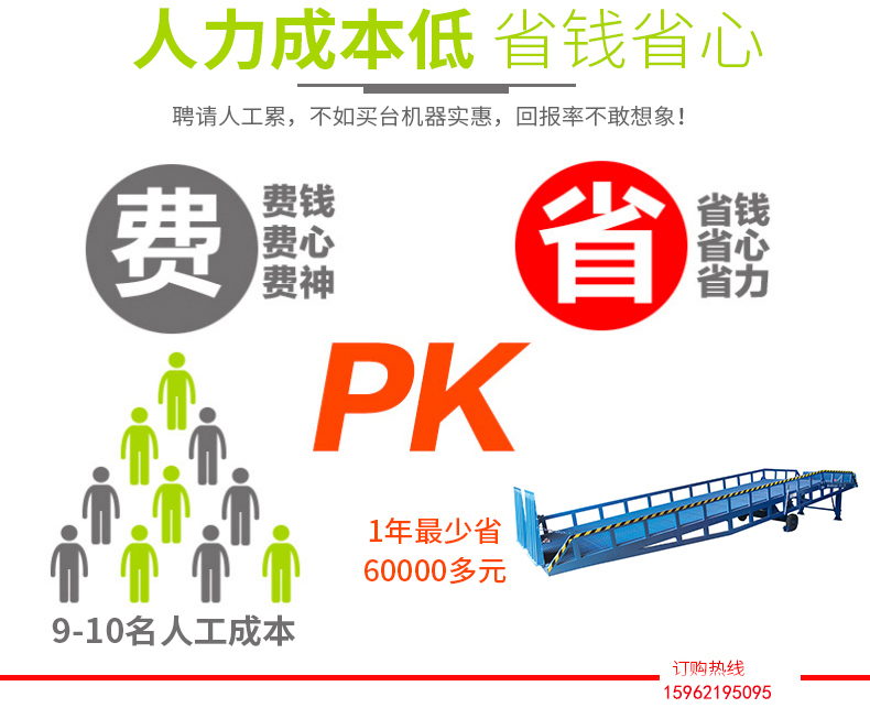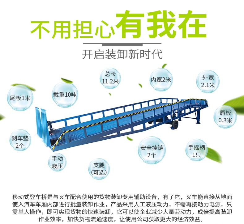 只需單人操作,不需動(dòng)力電源,即可實(shí)現(xiàn)貨物的安全快速裝卸。移動(dòng)式登車(chē)橋用于無(wú)裝卸設(shè)備的貨臺(tái)及流動(dòng)裝卸場(chǎng)所,是與叉車(chē)配合使用的貨物裝卸輔助設(shè)備??筛鶕?jù)汽車(chē)車(chē)廂的高低調(diào)節(jié)高度,叉車(chē)可以直接通過(guò)本設(shè)備駛?cè)胲?chē)廂內(nèi)部進(jìn)行貨物的批量裝裝卸。